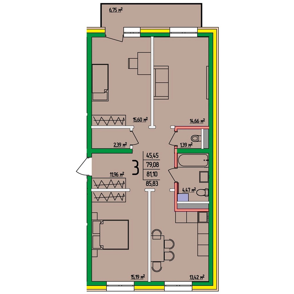 3‑комнатная квартира 81,10 м² (блок В/2)